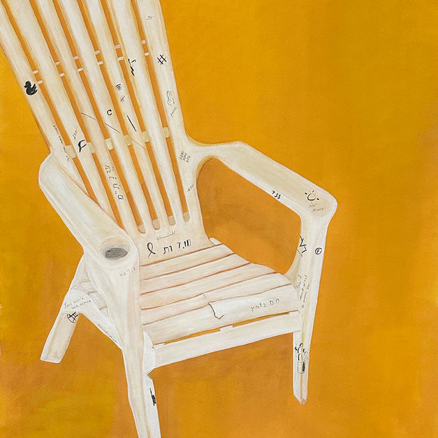 In Waiting transforms a simple plastic chair — a familiar element of Mediterranean everyday life — into a symbol of collective tension. The object stands empty yet full: covered with inscriptions, notes, and phrases in Hebrew and English. Each mark becomes a trace of lived experience — ironic, weary, yet still hopeful.